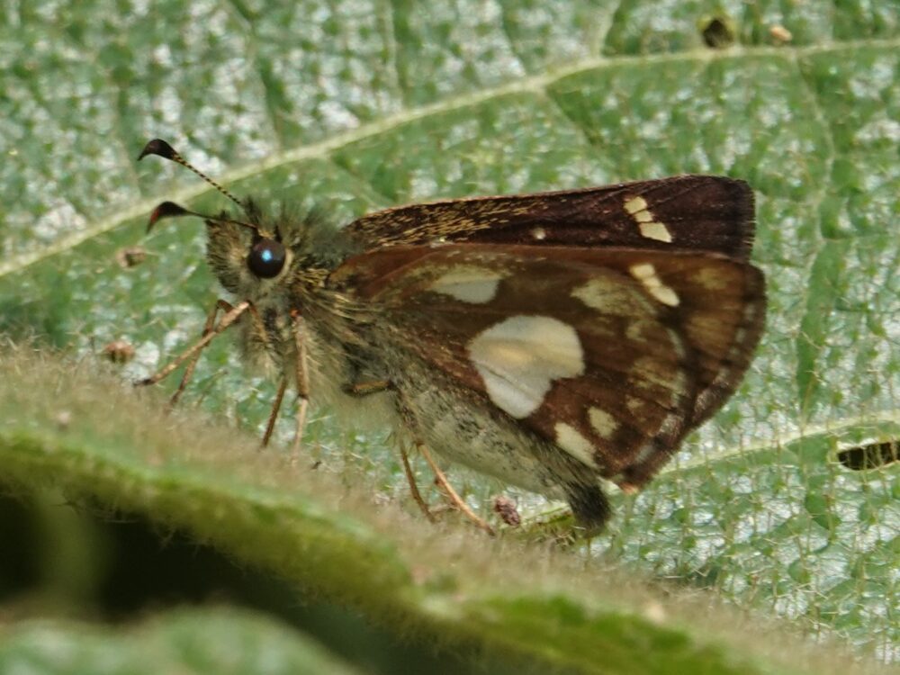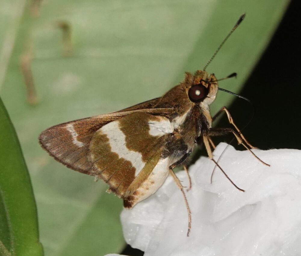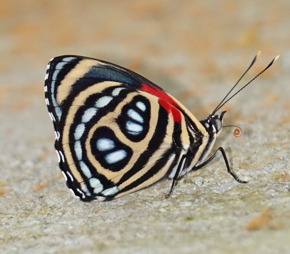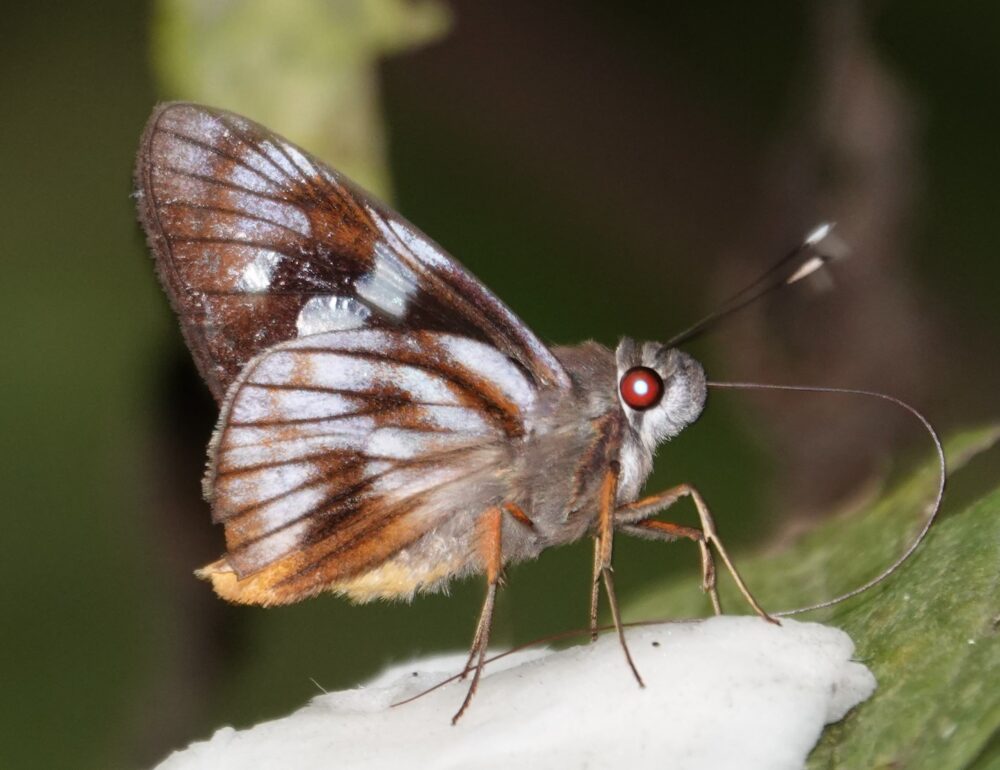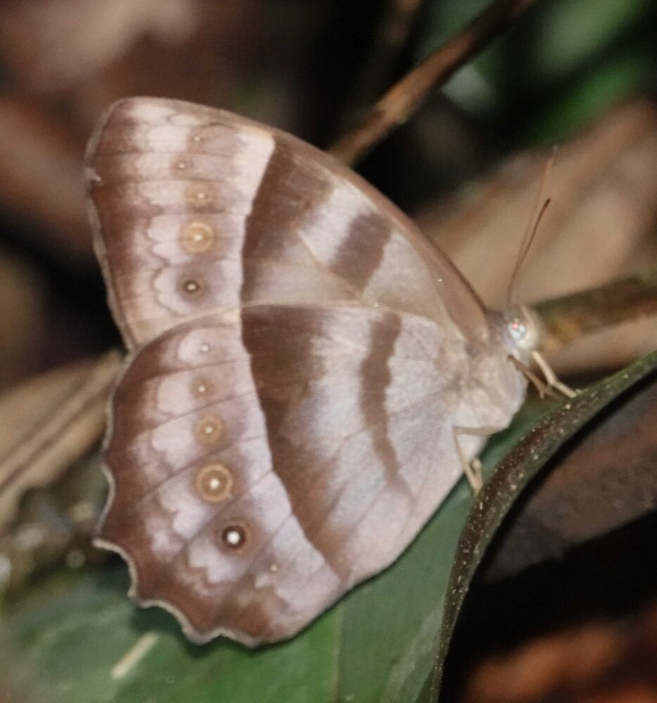 Epione Sister or White-Banded Sister (Adelpha epione agilla: Nymphalidae: Limenitidinae) Quebrada Quitacalzon, October 10, 2024 (photo by Steve Cary). This was perhaps the most distinctive of the ~15 different species of sisters (Adelpha sp.) that I photographed personally. One of 44 different sister species documented from the CosƱipata Valley. One of perhaps 250 species known from the Western Hemisphere.Two-Barred Flasher complex (Telegonus fulgerator complex: Hesperiidae: Eudaminae) Quitacalzon; October 10, 2024 (photo by Steve Cary)Copper-headed Sootywing (Bolla cupreiceps: Hesperiidae: Pyrginae) Quebrada Quitacalzon; October 10, 2024 (photo by Steve Cary). The study area was home to a large handful of various sootywing species, all very similar to our own Staphylus species. This one was the most distinctive. Reminded me of New Mexico’s Staphylus ceos.Magenta-banded Leafwing (Fountainea nessus: Nymphalidae: Charaxinae) Quebrada Quitacalzon; October 10, 2024 (Photo by Steve Cary). It was thrilling to watch this individual perch and bask laterally for a couple minutes, then gradually turn to align itself with the sun, then slowly open its wings to reveal an iridescent magenta/blue sheen that must really get the attention of nearby females. Quite a show!no English name (Caeruleuptychia tenera: Nymphalidae: Satyrinae) Quebrada Quitacalzon; October 10, 2024 (photo by Steve Cary). As best I can ascertain, the genus Caeruleuptychia was new for me despite three prior trips to Ecuador and Peru. Our leader, Dr. Gerardo Lamas, seemed particularly fond of this genus, which seems endemic to South America, and I appreciated the extra effort he made to point out details of wing marks. We might think that all the blue satyrs we saw were the same species, but in fact the underside ocelli vary quite a bit. I think I photographed six different species, and this was my favorite.Ornate Calligraph or Godart’s Numberwing or Pygas Eighty-eight (Catagramma pygas: Nymphalidae:Biblidinae) Quebrada Quitacalzon; October 10, 2024 (photo by Steve Cary)Frosted Giant Owl (Caligo idomeneus: Nymphalidae: Morphinae) Quebrada Quitacalzon; October 10, 2024 (photo by Steve Cary). Okay, not the greatest photo ever of a hand-sized “owl butterfly.” I was pleased with myself for spotting this guy in the roadside underbrush, then patiently waiting while it fidgeted around, probably trying to access my spilled bait. I snapped a sharp broadside view (not shown here, sorry) then finally it opened its wings enough for what I consider to be a rare view of the upperside, which simplified the identification to species.