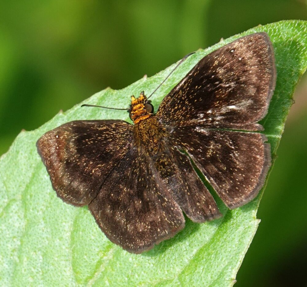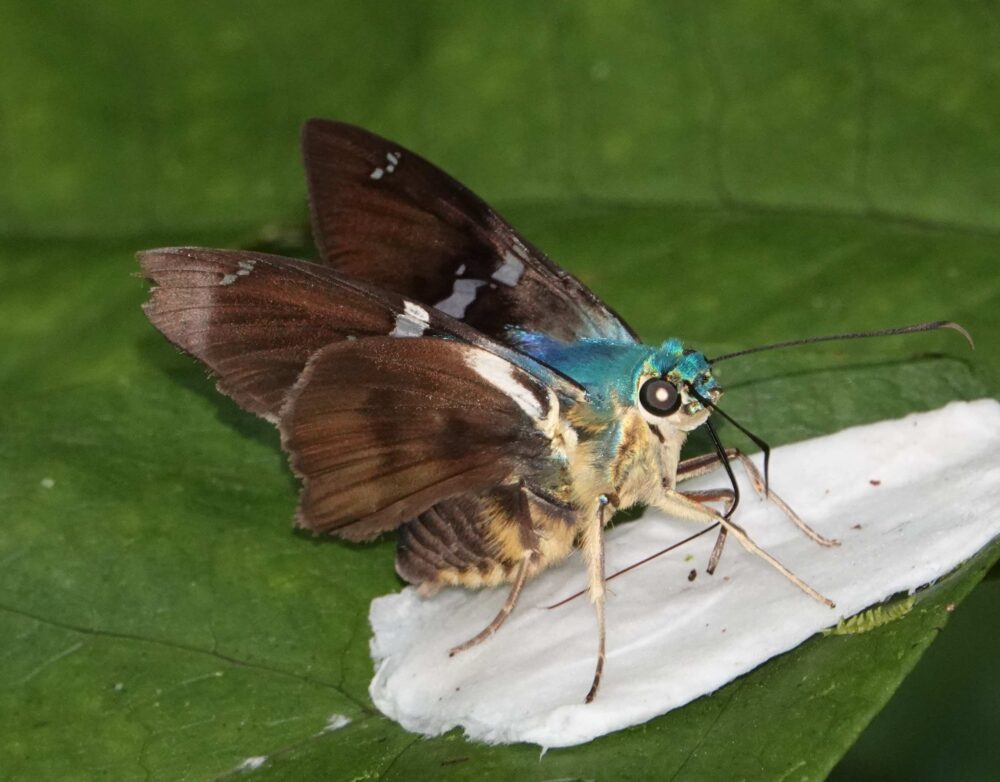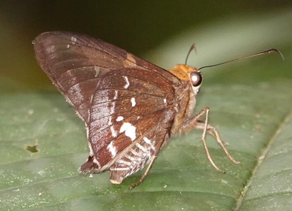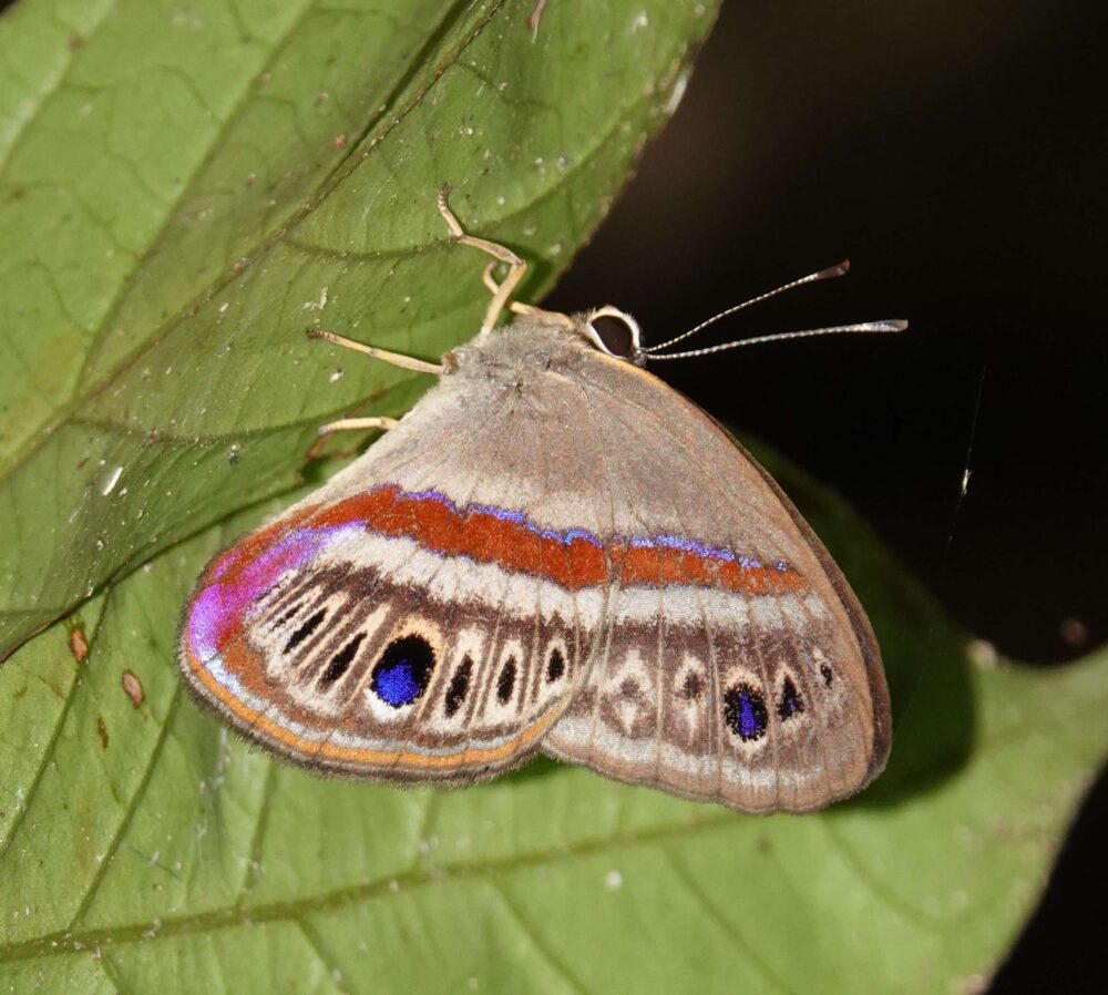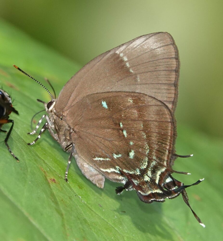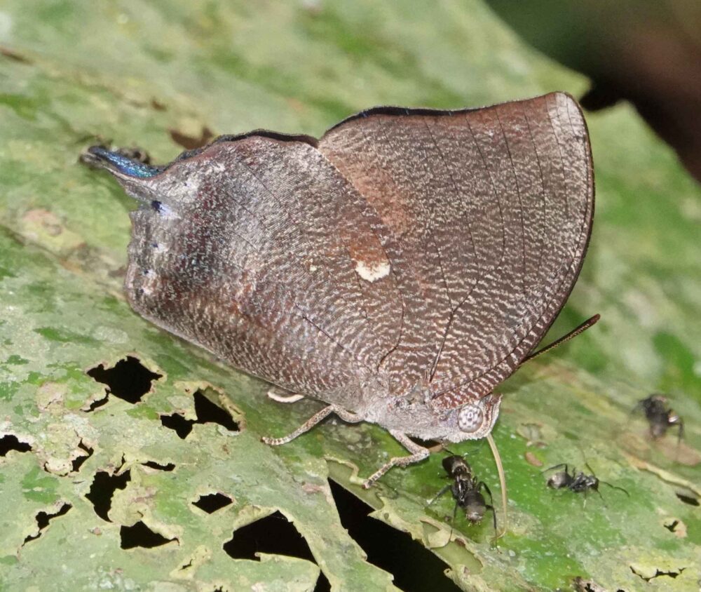 Godman’s Sarota (Sarota myrtea: Riodinidae: Riodininae) Chontachaka; October 12, 2023 (photo by Steve Cary). The metalmarks indeed were glorious, if tiny. Of the 65 species I photographed, this was the most exciting one for me because I had botched previous attempts years ago to photograph something in this genus: hairy legs and scintillating silver scales. This one plopped down in front of me, right on the trail edge, no bait involved. My first shot was from the rear (pretty embarrassing), but then it turned to bask laterally, offering a side view. I clicked off three more flash-assisted shots and was a happy camper.Olive Metron (Metron zimra: Hesperiidae: Hesperiinae)Rust-Coloured Round-Owl (Catoblepia berecynthia adjecta: Nymphalidae: Morphinae) Chontachaka; October 12, 2024 (photo by Steve Cary).Celmus Hairstreak (Celmia celmus: Lycaenidae: Theclinae) Chontachaka; October 12, 2024 (photo by Steve Cary) This may be the most common and widespread hairstreak in Amazon Basin. I include the image because it represents a landmark moment for me. For the first two field days, I struggled to even see the tiny hairstreaks, let alone photograph them. In my defense, there were a lot of flashy colors dodging about (see photos above) and it takes a lot of mental discipline not to follow the neon signs with your eyes.Sista Hairstreak (Janthecla sista: Lycaenidae: Theclinae) Chontachaka; October 12, 2024 (photo by Steve Cary). Finally, I managed to focus on the tiny hairstreaks that also were visiting baited leaves. They twinkled silver and blue (males anyway) when arriving and leaving, but while on the baited leaf they did not draw attention to themselves. I was very relieved to figure it out!