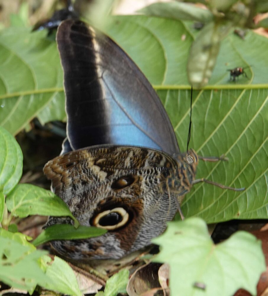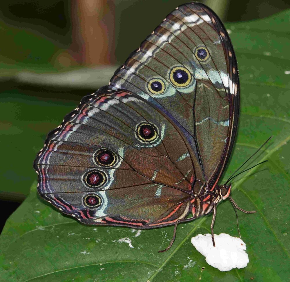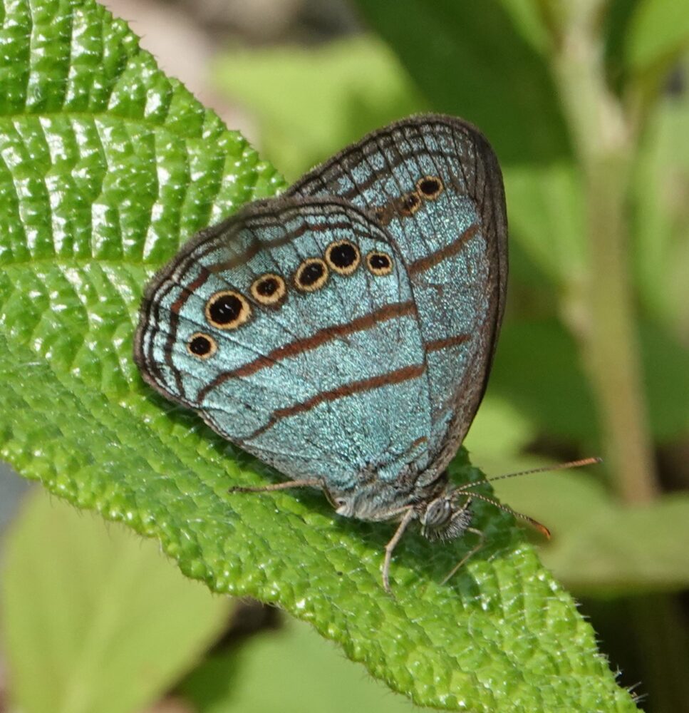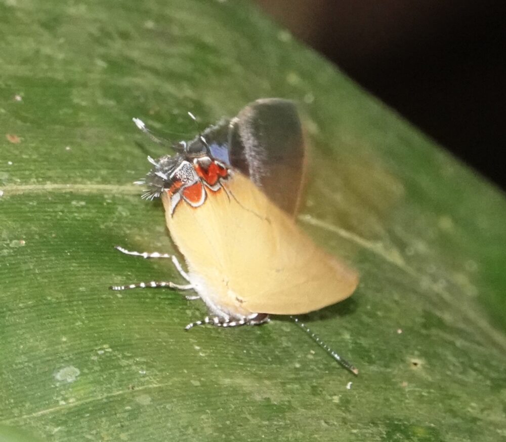 Croniades auraria(Hesperiidae: Pyrrhopyginae) Quitacalzon; October 21, 2024 (photo by Steve Cary). Firetip Skippers like this one are an exciting part of the butterfly experience in this part of the world; I photographed 12 species on this trip. New Mexico has one species in this group, the Dull Firetip (Apyrrothrix araxes), flying only in the southernmost part of our Bootheel. Tawny Leafwing (Zaretis isidora Nymphalidae: Charaxinae) Quitacalzon; October 21, 2024 (photo by Steve Cary). Not a bad dead-leaf mimic.Acontius Greatstreak (Denivia acontius: Lycaenidae: Theclinae) Quebrada Quitacalzon; October 21, 2024 (photo by Steve Cary). This was fun because when I first took the photos I thought was a routine greatstreak like Denivia phegeus, which is regularly seen in the study area. I would have been happy to see that one, too, but Mike McInnis right away caught the white smudge toward the apex of the forewing and concluded it was this bug – a new species for the study area!no English name found (Cariomothis erotylus Riodinidae: Riodininae) Quitacalzon; October 21, 2024 (photo by Steve Cary). a very distinctive metalmark only recorded one time in the study area prior to our trip in October 2024.Hassan Greenstreak (Chalybs hassan Lycaenidae: Theclinae) Quebrada Quitacalzon; October 21, 2024 (photo by Steve Cary). The green hairstreaks do have a particular allure. This was a lifer for me. Taken on our last day at this fantastic site, it was one of several tiny hairstreaks that I captured “on film.” A good day indeed.Lathy’s Hairstreak (Lamasina lathyi Lycaenidae: Theclinae) Quitacalzon; October 21, 2024 (photo by Steve Cary). Named to honor our fearless leader, Gerardo Lamas.The Achilles, Taper-Lined, or Blue-Banded Morpho (Morpho achilles phokylides Nymphalidae: Morphiniae) Quitacalzon; October 21, 2024 (photo by Steve Cary). For the duration of this expedition, I kept my eyes open for Morphos and studied their behavior to figure how to best photograph their glorious blue uppersides. Underside photos are not hard to get because they perch with wings closed. Photographing one in flight is out of the question because they move too fast and too jerkily. When perched, they sometimes open their wings briefly. On a couple of occasions I put the camera on “burst mode” and just clicked off about 2 shots per second, waiting for the perched Morpho to open. That approach did not always work, but it did here. I was in its space and it was not pleased with me; it moved around a bit, seemingly agitated, Finally on exposure 102 it opened.