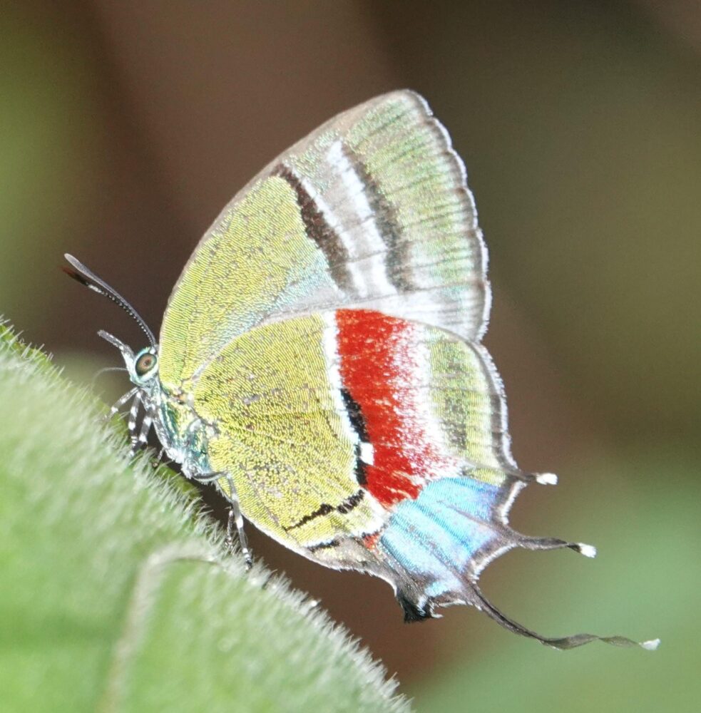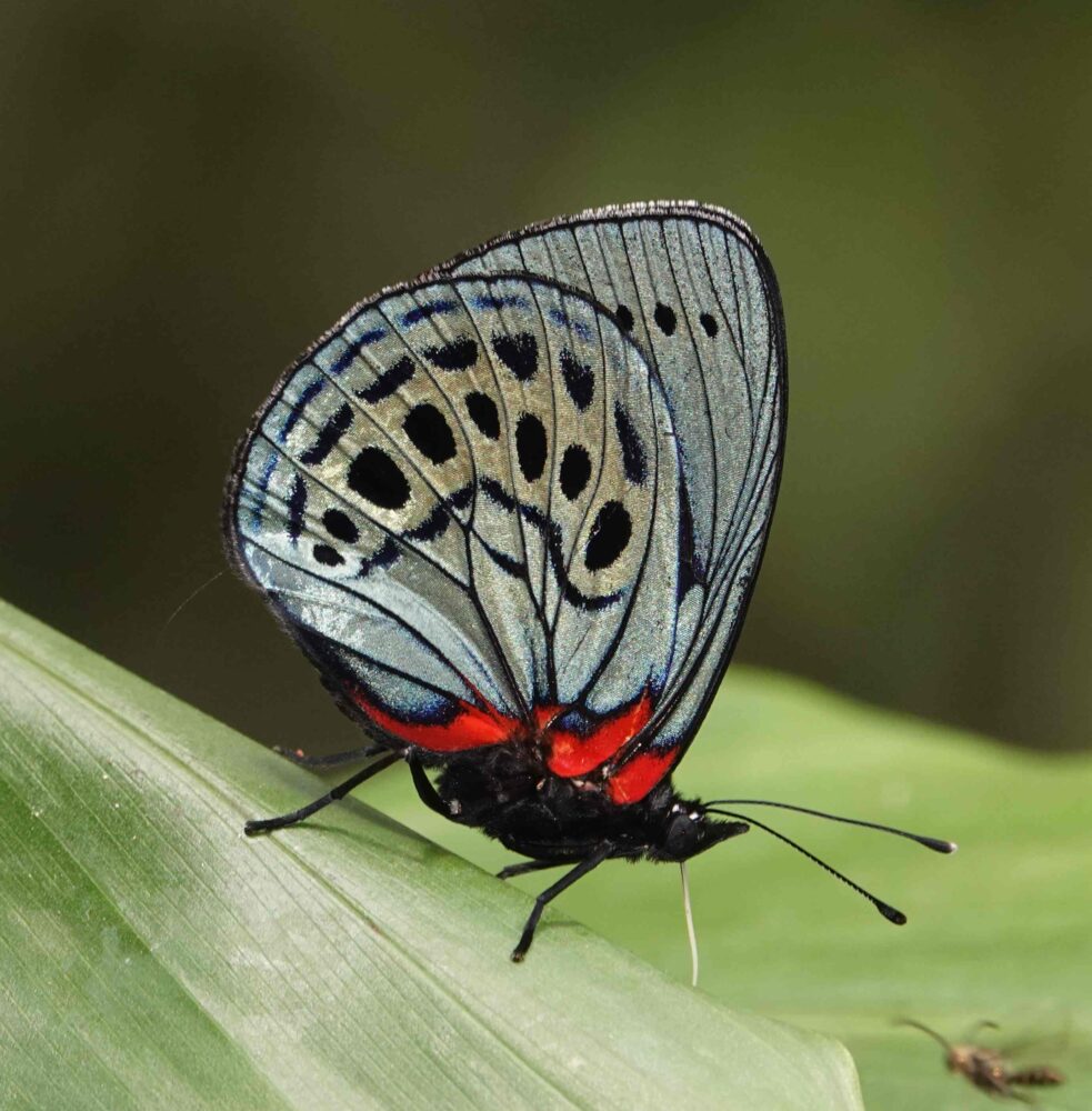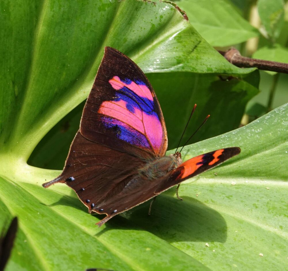 Croniades auraria(Hesperiidae: Pyrrhopyginae) Quitacalzon; October 21, 2024 (photo by Steve Cary). Firetip Skippers like this one are an exciting part of the butterfly experience in this part of the world; I photographed 12 species on this trip. New Mexico has one species in this group, the Dull Firetip (Apyrrothrix araxes), flying only in the southernmost part of our Bootheel. Tawny Leafwing (Zaretis isidora Nymphalidae: Charaxinae) Quitacalzon; October 21, 2024 (photo by Steve Cary). Not a bad dead-leaf mimic.Acontius Greatstreak (Denivia acontius: Lycaenidae: Theclinae) Quebrada Quitacalzon; October 21, 2024 (photo by Steve Cary). This was fun because when I first took the photos I thought was a routine greatstreak like Denivia phegeus, which is regularly seen in the study area. I would have been happy to see that one, too, but Mike McInnis right away caught the white smudge toward the apex of the forewing and concluded it was this bug – a new species for the study area!no English name found (Cariomothis erotylus Riodinidae: Riodininae) Quitacalzon; October 21, 2024 (photo by Steve Cary). a very distinctive metalmark only recorded one time in the study area prior to our trip in October 2024.Hassan Greenstreak (Chalybs hassan Lycaenidae: Theclinae) Quebrada Quitacalzon; October 21, 2024 (photo by Steve Cary). The green hairstreaks do have a particular allure. This was a lifer for me. Taken on our last day at this fantastic site, it was one of several tiny hairstreaks that I captured “on film.” A good day indeed.Lathy’s Hairstreak (Lamasina lathyi Lycaenidae: Theclinae) Quitacalzon; October 21, 2024 (photo by Steve Cary). Named to honor our fearless leader, Gerardo Lamas.The Achilles, Taper-Lined, or Blue-Banded Morpho (Morpho achilles phokylides Nymphalidae: Morphiniae) Quitacalzon; October 21, 2024 (photo by Steve Cary). For the duration of this expedition, I kept my eyes open for Morphos and studied their behavior to figure how to best photograph their glorious blue uppersides. Underside photos are not hard to get because they perch with wings closed. Photographing one in flight is out of the question because they move too fast and too jerkily. When perched, they sometimes open their wings briefly. On a couple of occasions I put the camera on “burst mode” and just clicked off about 2 shots per second, waiting for the perched Morpho to open. That approach did not always work, but it did here. I was in its space and it was not pleased with me; it moved around a bit, seemingly agitated, Finally on exposure 102 it opened.