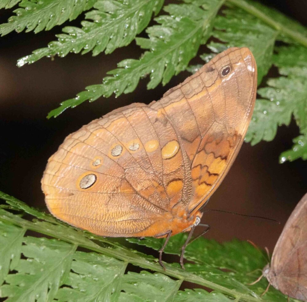 Cleopatra Shadeflitter (Taygetis cleopatra male (left) and female (right): Nymphalidae: Satyrinae) Pantiacolla; October 14, 2024 (photos by Steve Cary). I thought that the number and variety of satyrs would decline as we went to lower elevations. Boy, was I wrong! There were many new genera and many lovely, large brown things flopping through forest. Here are two that I first thought were separate species, but they both keyed to Cleopatra; Gerardo confirmed they were male and female of this sexually dimorphic species.