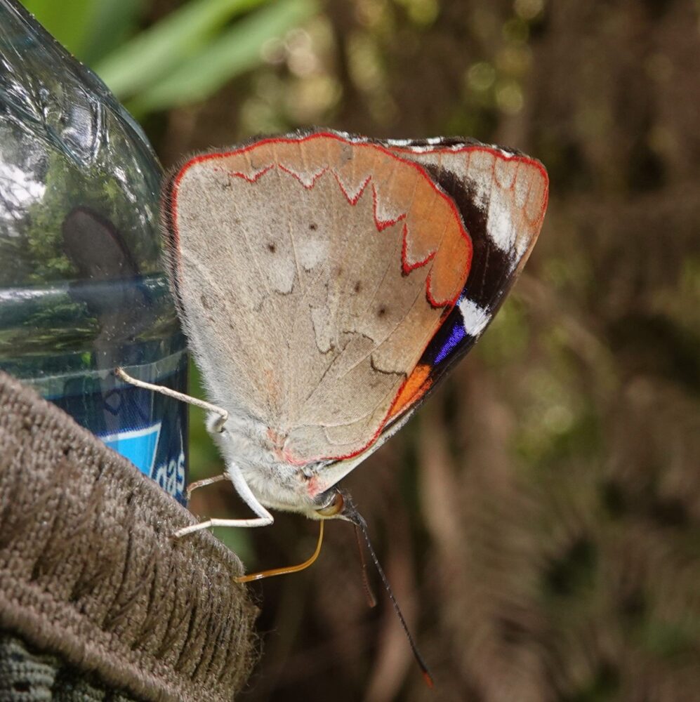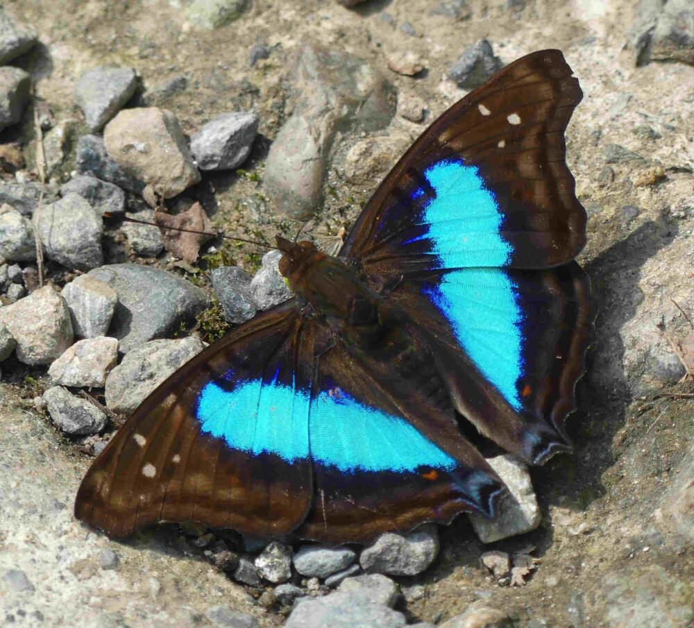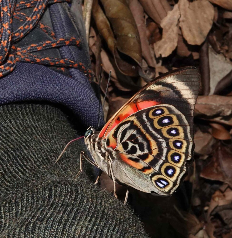 A second thing to keep in mind is that virtually all our interactions with butterflies were enabled or facilitated by the team’s use of various baits or traps. Spitwads were favored by skipper lovers. The rest of us, every day, fabricated and sprayed onto trailside vegetation a liquid mixture of urine (electrolytes) and rotting fish (the odor that draws them in). Such practice is not typical in the US; I never use baits here in NM because most butterflies come readily to flowers at eye level or below. But in South America, simply walking and observing in unbaited habitat might get you 10% of all the species that are there. Most are up in the trees and thus inaccessible to earth-bound humans. Many collectors use long-handled nets. Bait provides highly prized electrolytes which draw the vast majority of butterflies down to earth and holds them still while you watch, click, or swing.