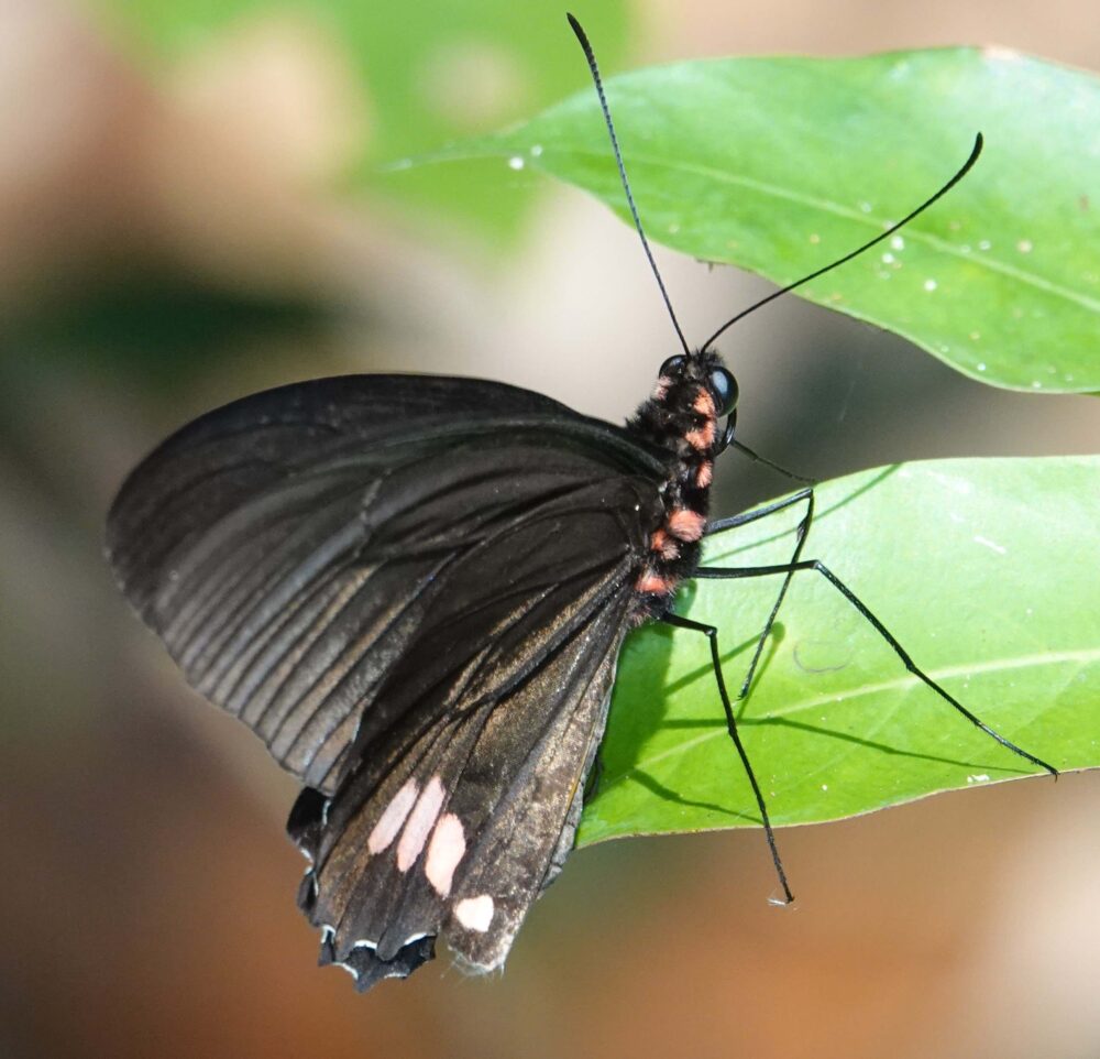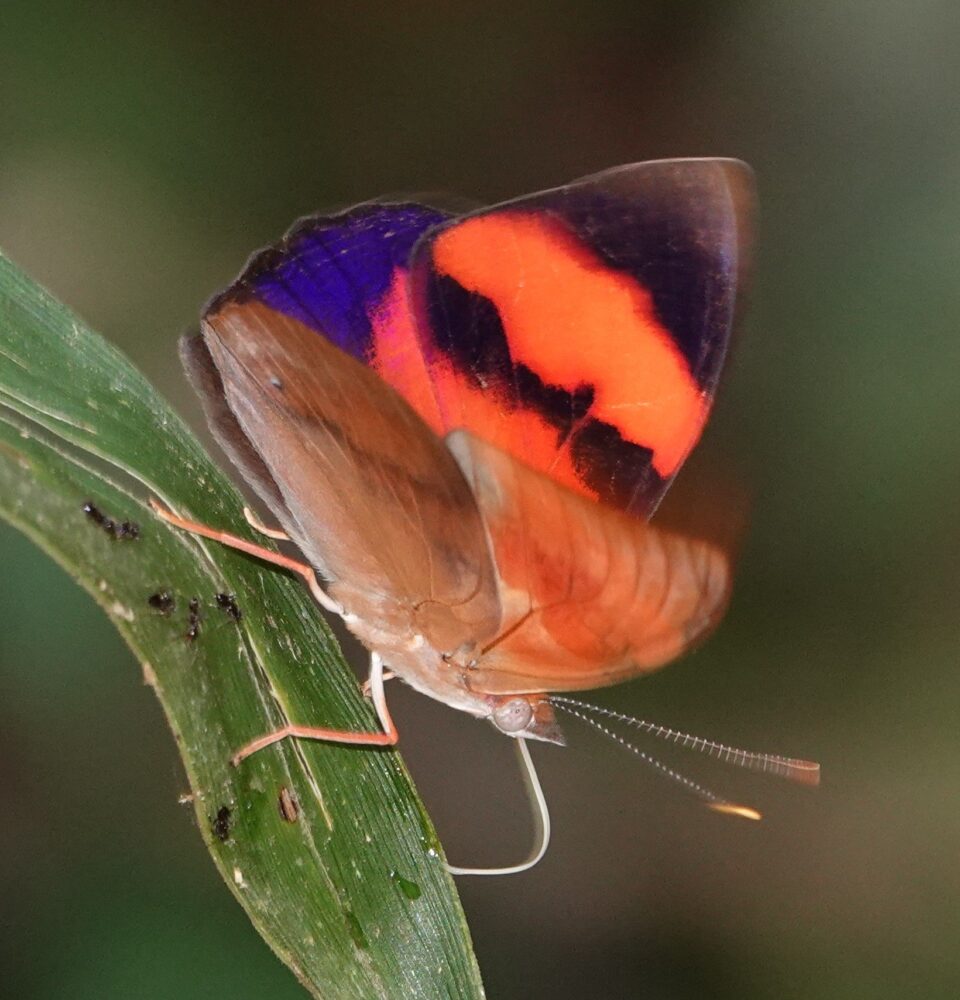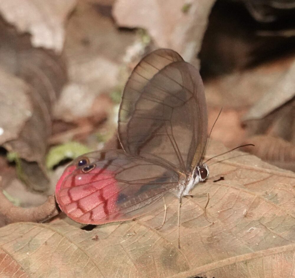 Trebula Groundstreak (Calycopis trebula: Lycaenidae: Theclinae) Pantiacolla; October 17, 2024 (photo by Steve Cary). Some butterflies are (understandably) flash-wary. I rarely use a flash in New Mexico, but in the cloudforest it is a necessity, so I did my best, deploying a fill flash on almost every shot. Some butterflies seem not to notice the flash, but others react, sometimes instantaneously, or so it seems. The flash has some duration, admittedly brief, but occasionally a butterfly’s quick reflex, results in a quick pic of a bug departing the scene as fast as it can. In this case the butterfly tipped over head-first. It seemed a bit humorous to me, but was undoubtedly a fright for the ‘streak, or at least an embarrassment :^)Amazonian Rose-Phantom or Blushing Phantom (Cithaerias aurorina Nymphalidae: Satyrinae) Pantiacolla; October 18, 2024 (photo by Steve Cary). It’s quite a special experience to watch the various phantom-satyrs flit patiently along the shady forest floor and trails . . .Emerald-Patched Cattleheart (Parides sesostris: Papilionidae: Papilioninae) Pantiacolla; October 18, 2024 (photo by Steve Cary). One of few swallowtail species seen on the entire trip.