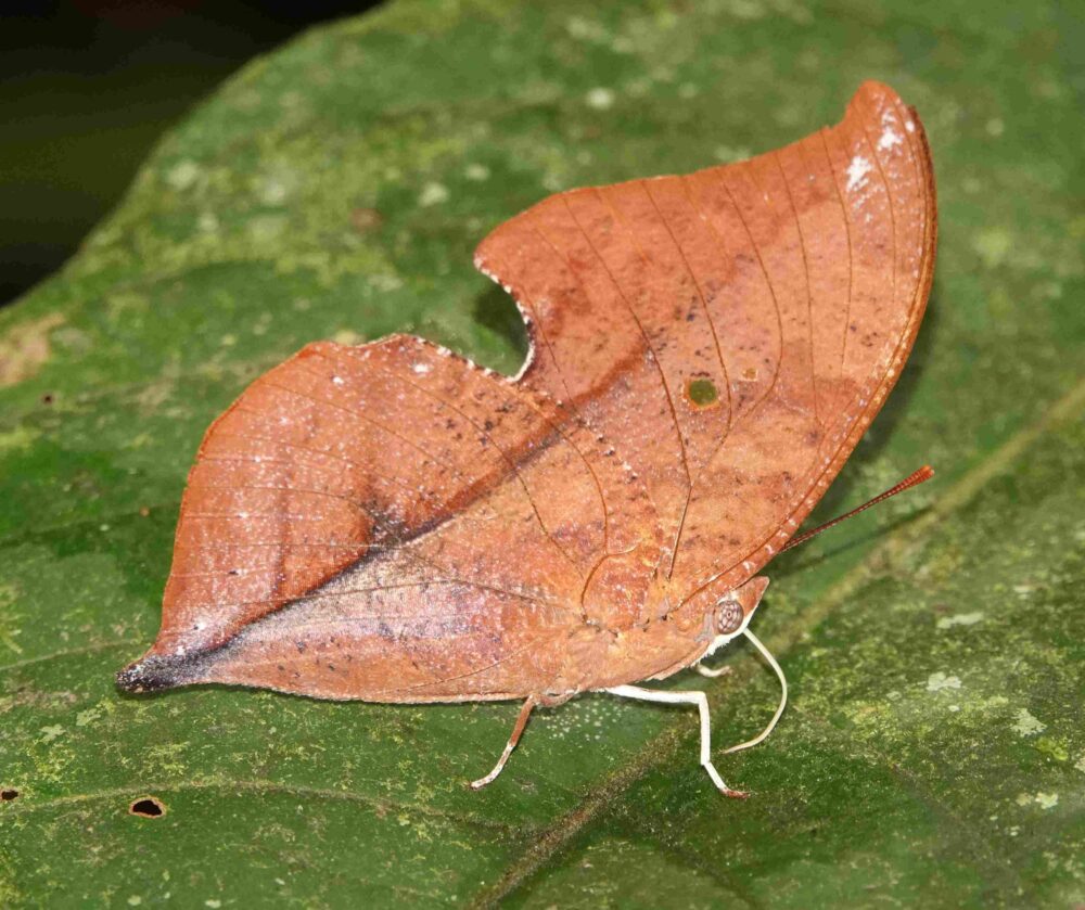 Vermiculated Leafwing or Glauce Leafwing (Memphis g. glauce Nymphalidae: Charaxinae) Pantiacolla; October 16, 2024 (photo by Steve Cary). There are dozens of Memphis species in Peru and the Amazon. Their undersides are amazing and variable dead leaf mimics. Uppersides tend to be the most diagnostic, but getting those photos takes luck and patience. They are closely related to our leafwings (Anaea species).