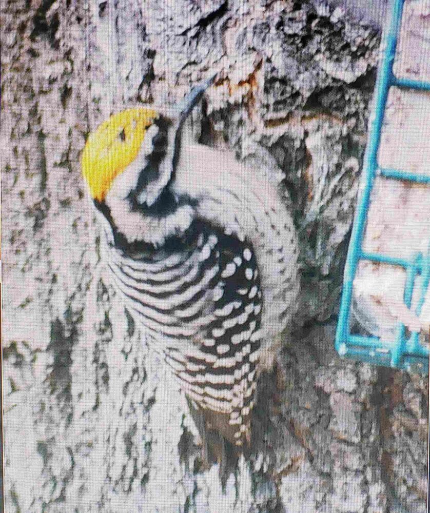 A Christmas Day appearance at the suet block in our backyard of a rare yellow-crowned variant of Ladderback Woodpecker, normally red-crowned. I am told by birder colleagues that one was seen here in Santa Fe last year, too. Maybe the same one?